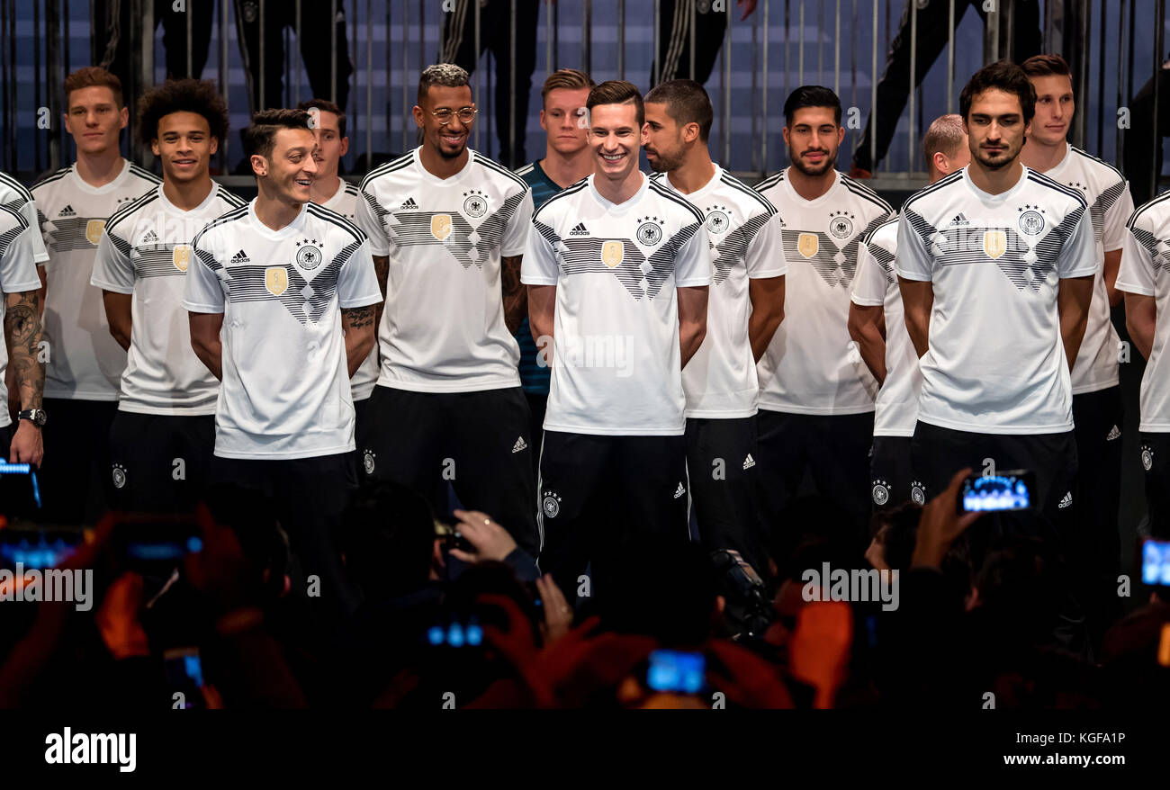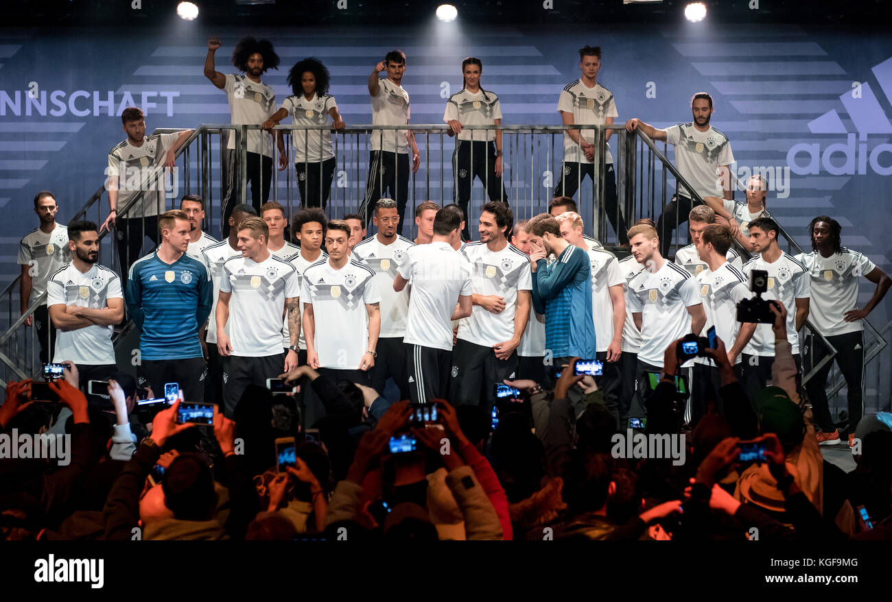 Spieler Der Deutschen Fussball Nationalmannschaft Stehen Auf Der Und Die Neuen Buehne Praesentieren Adidas Trikots Am Heutigen Montag Praesentierte Adidas A Berlin Das Neue Heim Trikot Der Deutschen Fussball Nationalmannschaft Ges Fussball Dfb